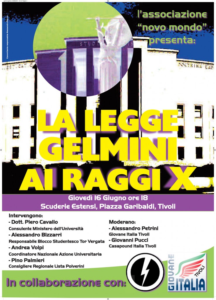 L’associazione “NOVO MONDO” presenta l’evento LA LEGGE GELMINI AI RAGGI X. Giovedi 16 Giugno ore 18.00, Scuderie Estensi – Piazza Garibaldi – Tivoli.