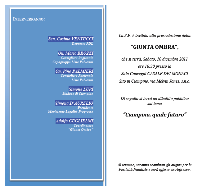 sono lieto di invitarVi alla presentazione della ”Giunta ombra” e al Dibattito Pubblico dal titolo “Ciampino, quale futuro” che si terrà sabato 10 dicembre p.v. alle ore 16.30 presso la sala convegni Casale dei Monaci (via Melvin Jones snc – Ciampino).
