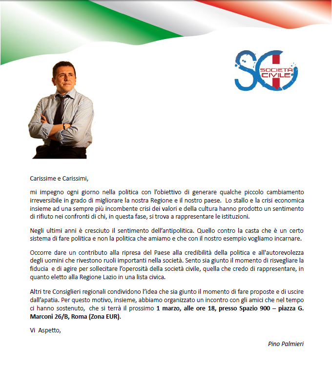 Occorre dare un contributo alla ripresa del Paese alla credibilità della politica e all’autorevolezza degli uomini che rivestono ruoli importanti nella società. Sento sia giunto il momento di risvegliare la fiducia e di agire per sollecitare l’operosità della società civile, quella che credo di rappresentare, in quanto eletto alla Regione Lazio in una lista civica.
