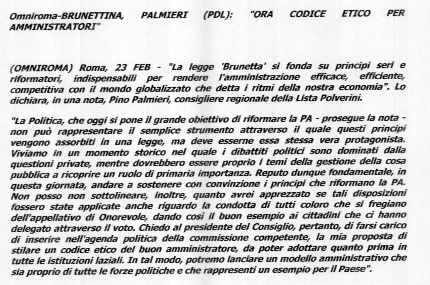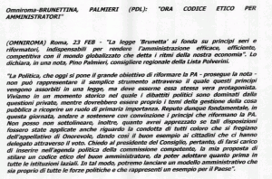 Comunicato del 23 Febbraio 2011 – LEGGE BRUNETTA, PALMIERI (LP): “Ora codice etico per amministratori”